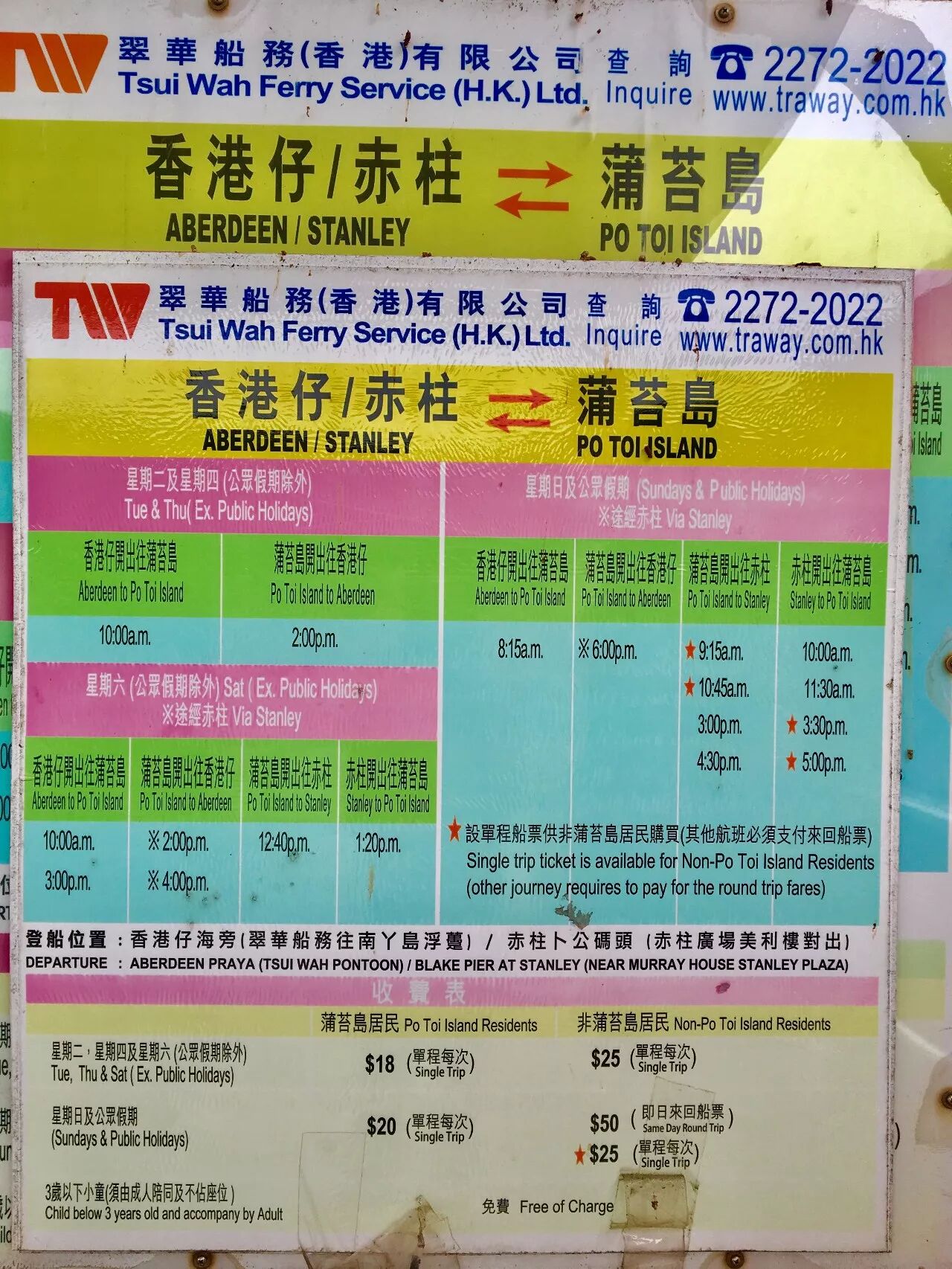 翠華船務 Tsui Wah Ferry Serviceによる香港仔赤柱 - 蒲台島番線の時刻表地図上での経路特定の駅への到着時間運行状況アラートをチェック. 1400 1600 星期日及公眾假期. 視乎由赤柱或 香港仔出發 蒲台島前往蒲台島船程需約半小時至1小時.
